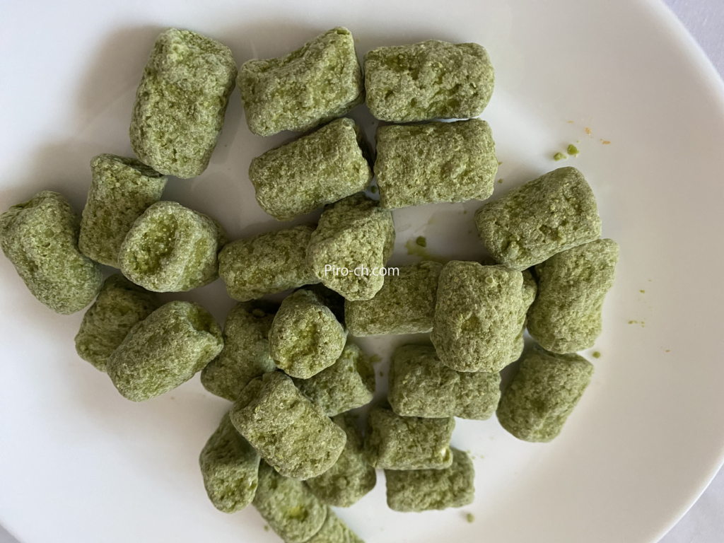 中身は写真の通り。抹茶味チョコでコーティングされたマシュマロです。食感はマシュマロ。味は抹茶味。想像できる味。自分は美味いと思う。一度賞味あれ。