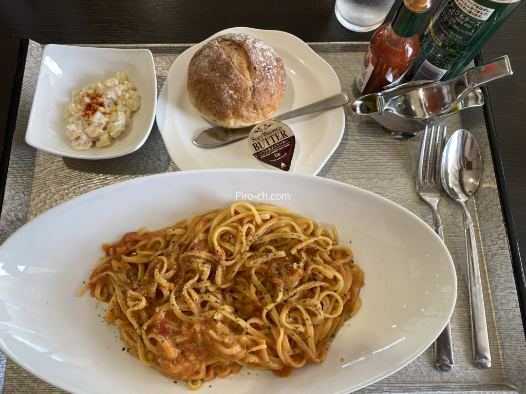 昼食はカニパスタ。すごいカニ味。美味しい。