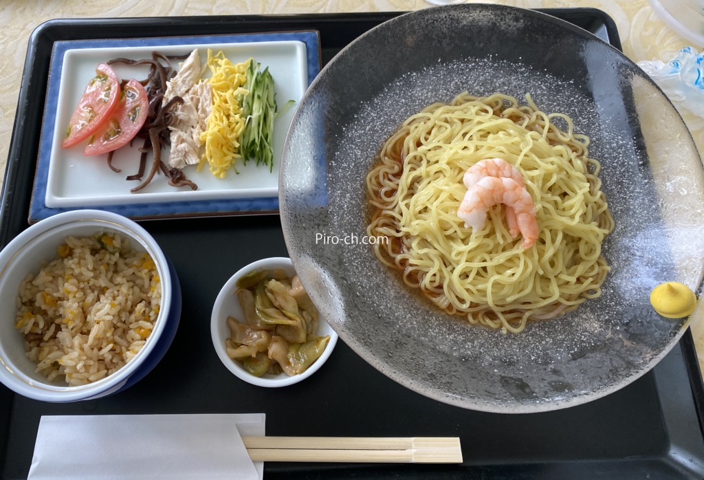 昼食は冷やし中華で。ミルフィーユゴルフクラブの冷やし中華は具がセパレートで来る。