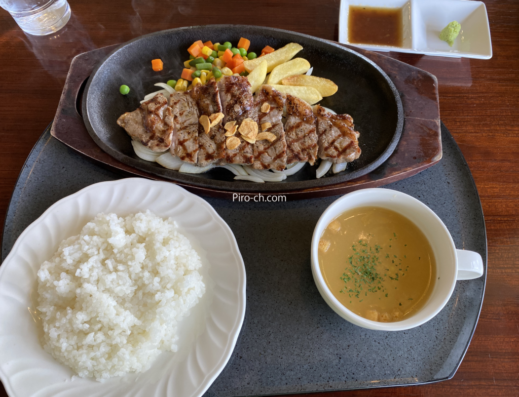 昼食は奮発して、+¥700でステーキを食べた。コーンポタージュスープが美味しかった。肉はもちろん旨し。